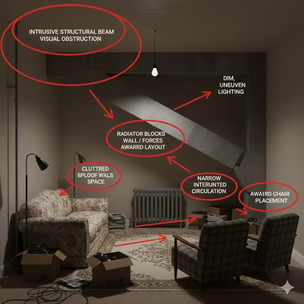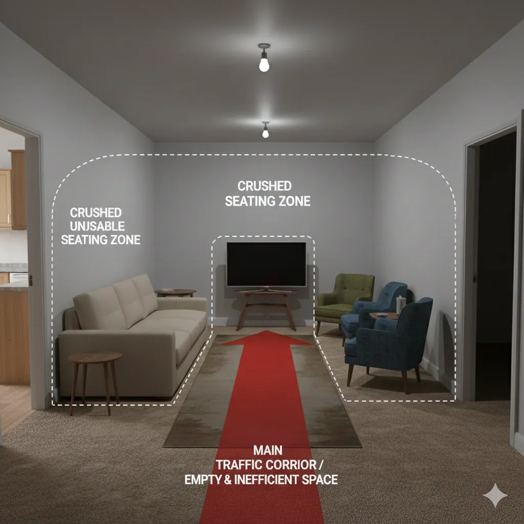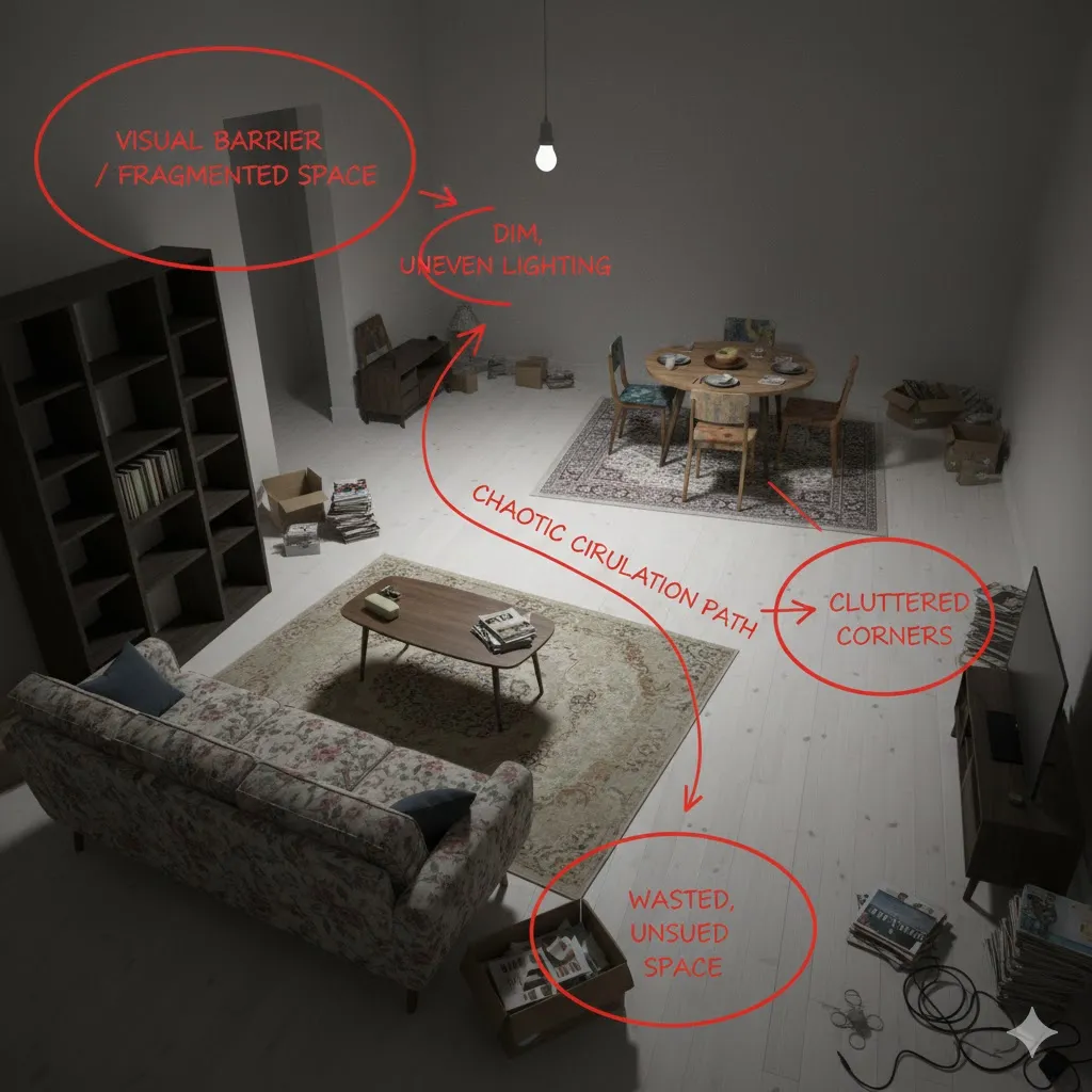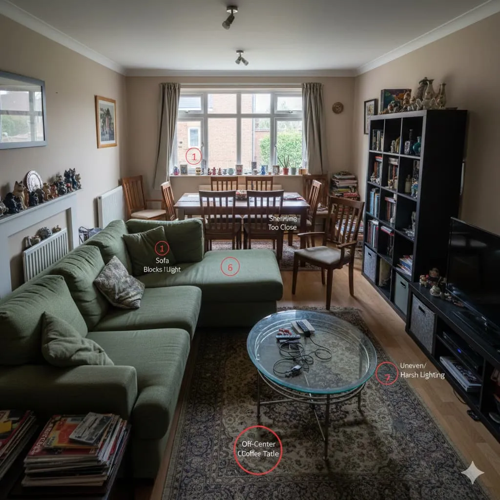 My open plan area felt awkward and disjointed. The diagnosis explained the broken sightlines and fixed the furniture grouping.